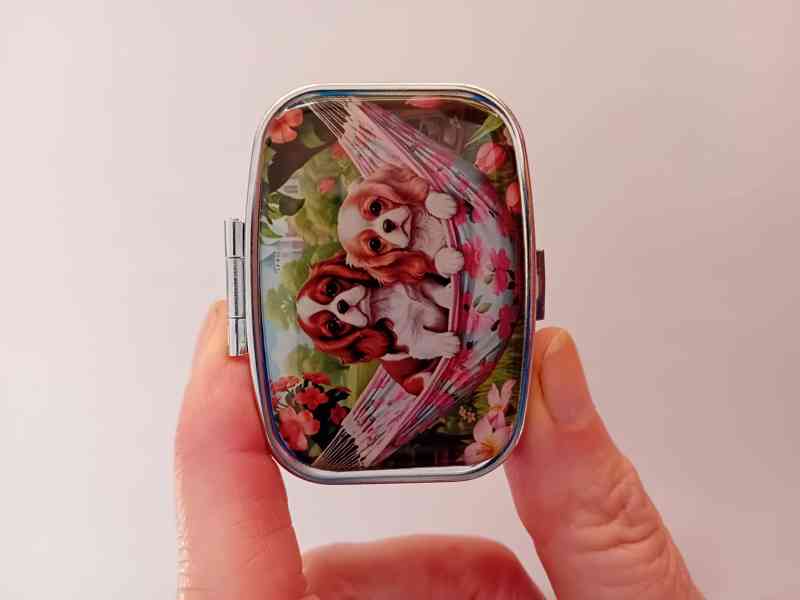 Roztomilá krabička na cestování třeba na léky, naušnice ,stíny na oči a pod. se zrcátkem ve víčku. Velikost krabičky je 5,5x5cm. Cena za 1kus -79 Kč.