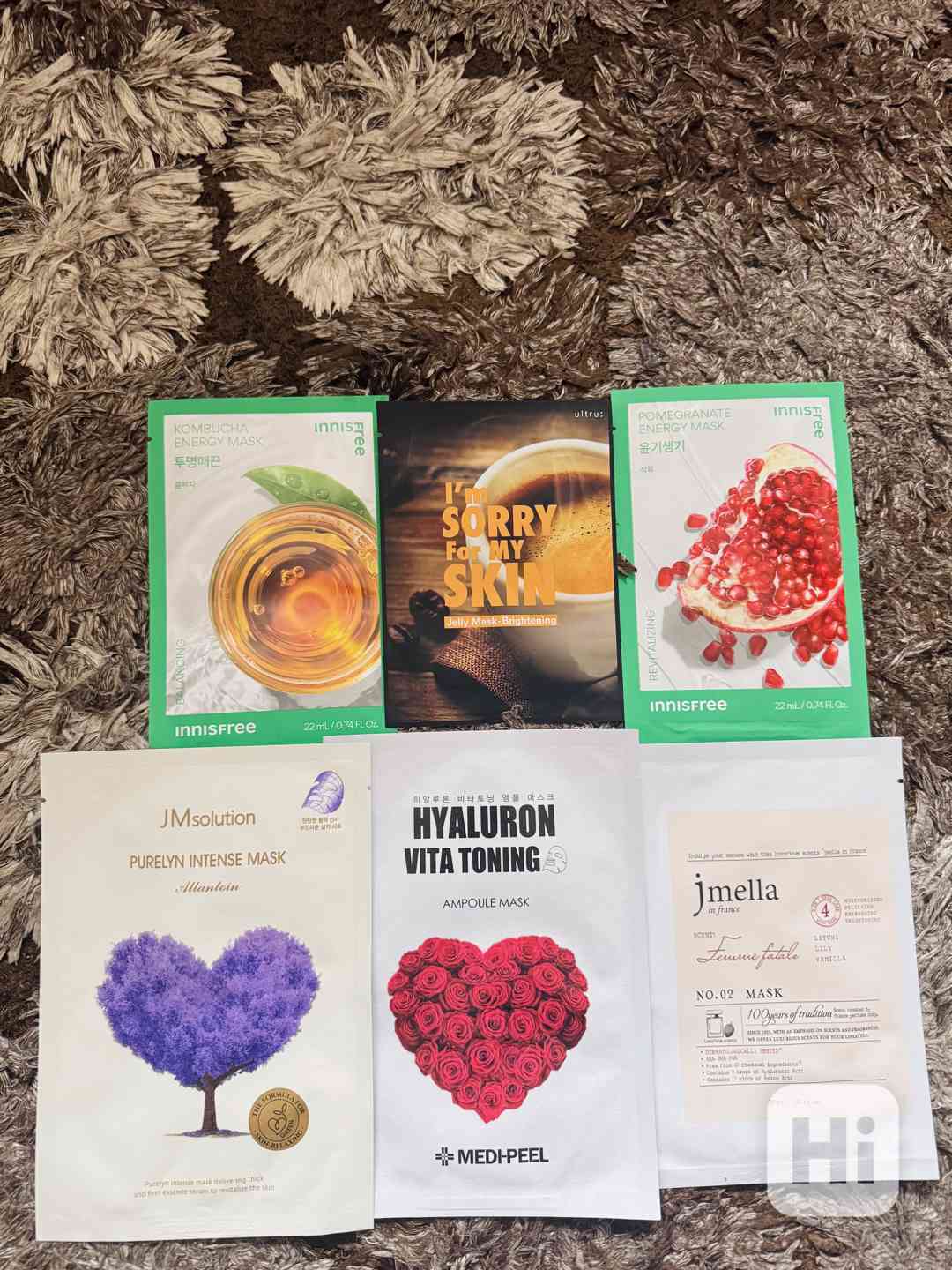 Sada 6 pleťových masek korejské kosmetiky (Innisfree, JMsolution, Medi-Peel, Jmella, I’m Sorry For My Skin). Vše nové, neotevřené. Hydratační, zpevňující a rozjasňující účinky.